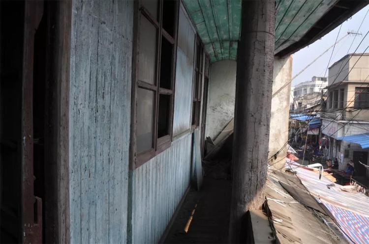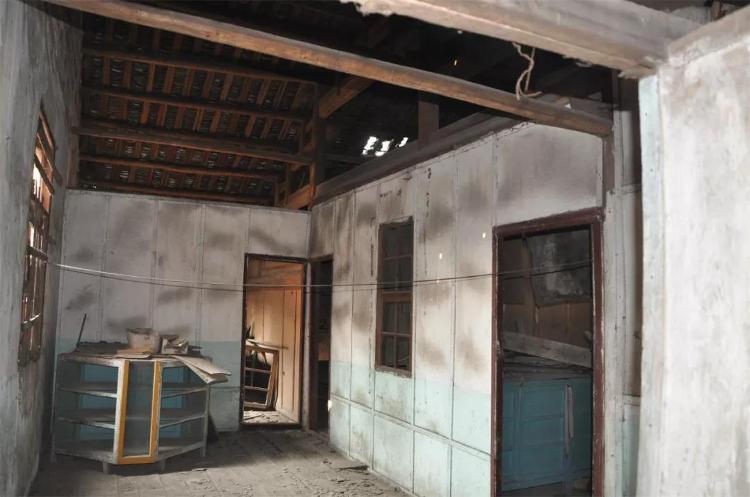 故居第一进为三开间通铺,进深 12.82 米(含前檐 1.4 米)。为便于使用和采光,又分为前后两部分,前后均为双坡屋面,后屋面高于前屋面,后部屋面前坡落水经前部屋面后坡通过天沟引入二进天井。前半部二层全部有楼板,为商铺存货之用。后半部分明间上空,用于上下大宗货物和采光之空间,两侧次间为与前半部分相通的储货楼面。