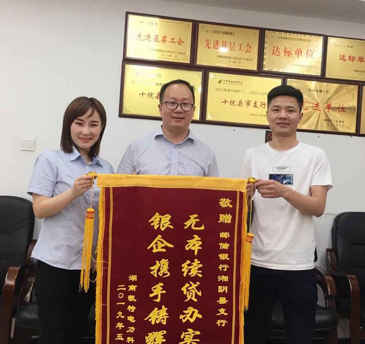 2019年6月3日,湖南凯特电力科技有限公司的张总亲自来到中国邮政储蓄银行湘阴县支行,送上写有“无本续贷办实事,银企携手铸辉煌”的锦旗,衷心感谢邮储银行湘阴县支行在该企业申请续贷过程中给予的贴心服务与政策指导。