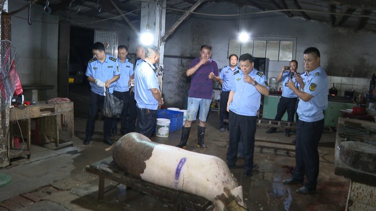 凌晨4点,当执法人员来到鹤龙湖东垸村进行突击检查时,发现一处私人非法屠宰场有2名男子正在私自屠宰生猪。执法人员对该场所猪肉进行检验,发现被屠宰的生猪没有“三证两章”属于典型白板肉。执法人员当场将猪肉以及屠宰工具等进行收缴,并对非法屠宰老板进行口头传唤。目前,该案正在审理当中。