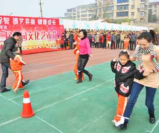 学生主持,全员参与,家长互动。12月13日,县滨湖学校第二届“校园文化艺术节”开幕。开幕式上,师生同台进行了行进打击乐队奏乐、健美操表演、葫芦丝演奏、武术表演、舞蹈与读唱等文艺汇演。期间,还举办了1、2年级亲子运动会。学生家长与自己的宝贝互动,进行了二人三足跑、袋鼠跳接力赛、踩气球等游戏。据悉,整个艺术节将持续到本月24日,还将举行器乐比赛、校园舞蹈大赛、校园英语歌曲比赛、艺术作品展示等系列活动。