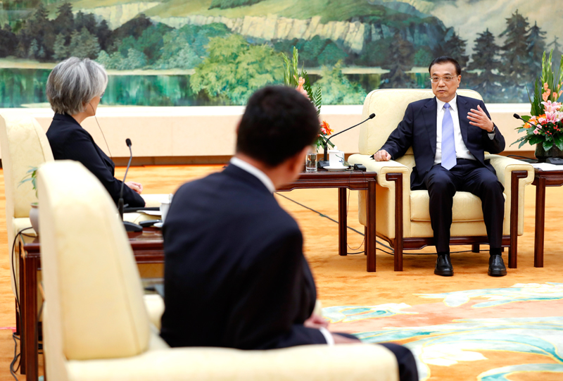国务院总理李克强8月22日上午在人民大会堂会见来华出席中日韩外长会的韩国外长康京和、日本外相河野太郎。