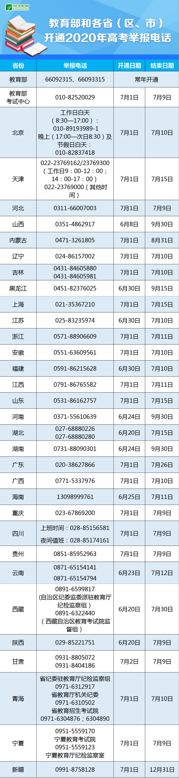 教育部和各省(区、市)开通2020年高考举报电话