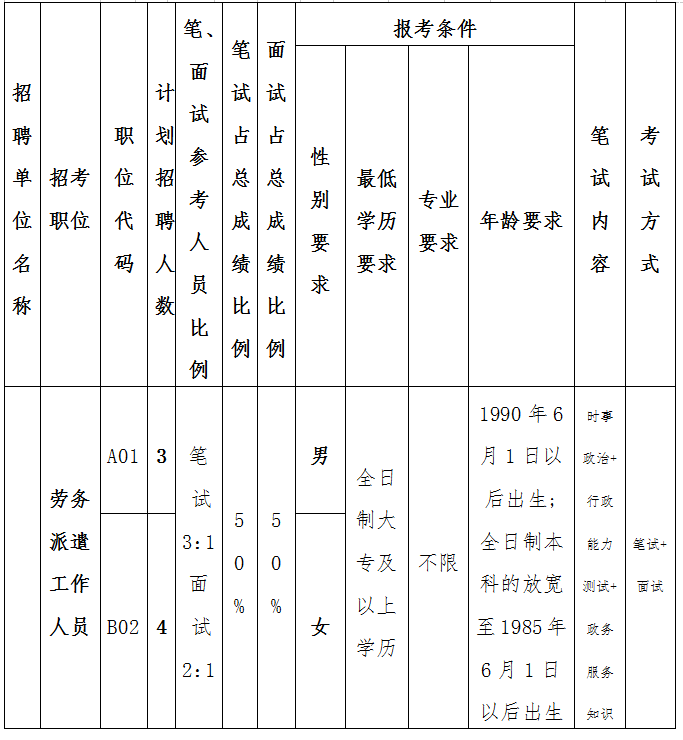 公开招聘劳务派遣制工作人员岗位条件表