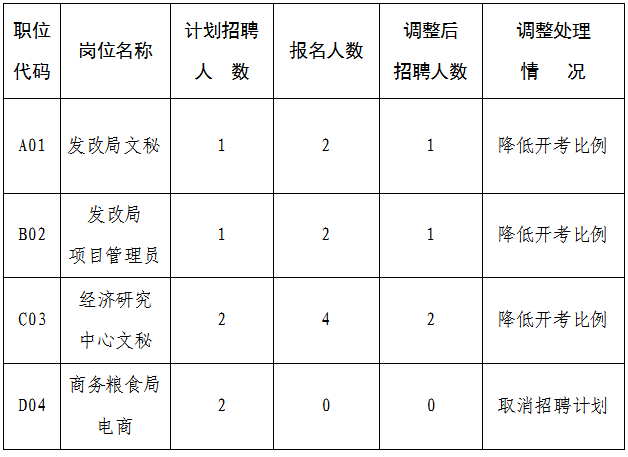湘阴县公开选调全额事业工作人员报名工作已经结束,根据《湖南省事业单位公开招聘人员办法》(湘人社发〔2019〕1号)和《湘阴县公开选调全额事业工作人员公告》的规定,综合报名情况,本次招聘共有4个岗位没有达到规定的开考比例。为了顺利开展后续招聘工作,经招聘单位申请,湘阴县公开选调工作领导小组研究同意,决定对没有达到开考比例的招聘岗位计划数作如下调整。其中,调整降低开考比例的岗位3个,取消招聘计划的岗位1个。(具体岗位调整情况见附表)。