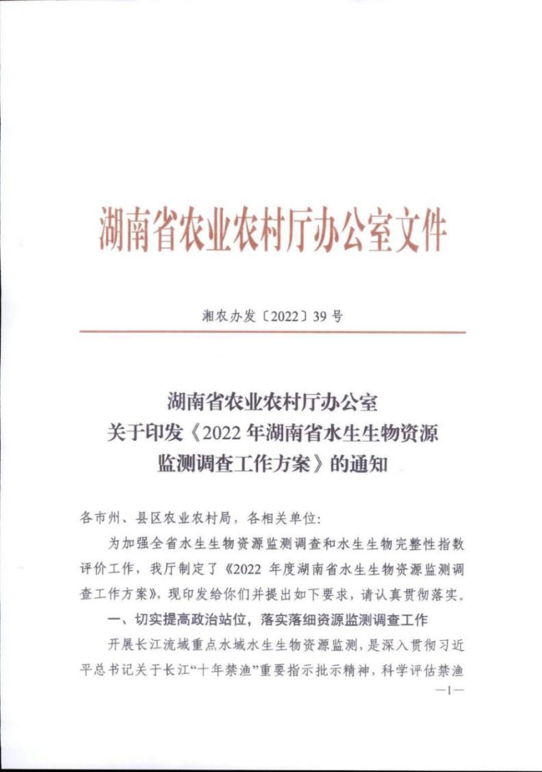 附件∶《湖南省农业农村厅办公室关于印发〈2022年湖南省水生生物资源监测调查工作方案〉的通知》