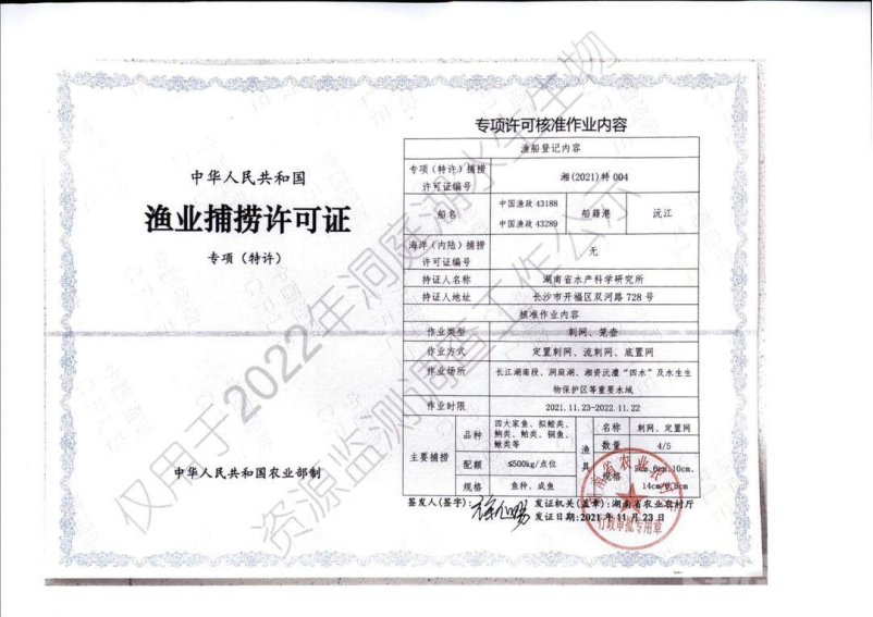 为贯彻落实《农业农村部办公厅关于加强和规范长江流域水生生物监测调查工作的通知》(农办长渔〔2021)2号)及长江"十年禁渔"相关文件精神,进一步强化渔业资源监测评估工作,为洞庭湖水生生物资源养护、珍稀濒危水生动物保护、洞庭湖污染防治和生态保护决策及洞庭湖经济圈发展中资源环境保护的规划提供资料支撑,根据农业农村部长江流域渔政监督管理办公室相关要求,经省农业农村厅批准,由省水产科学研究所在我县横岭湖省级自然保护区和湘江水域组织开展科研特许捕捞活动,现将有关情况公告如下∶