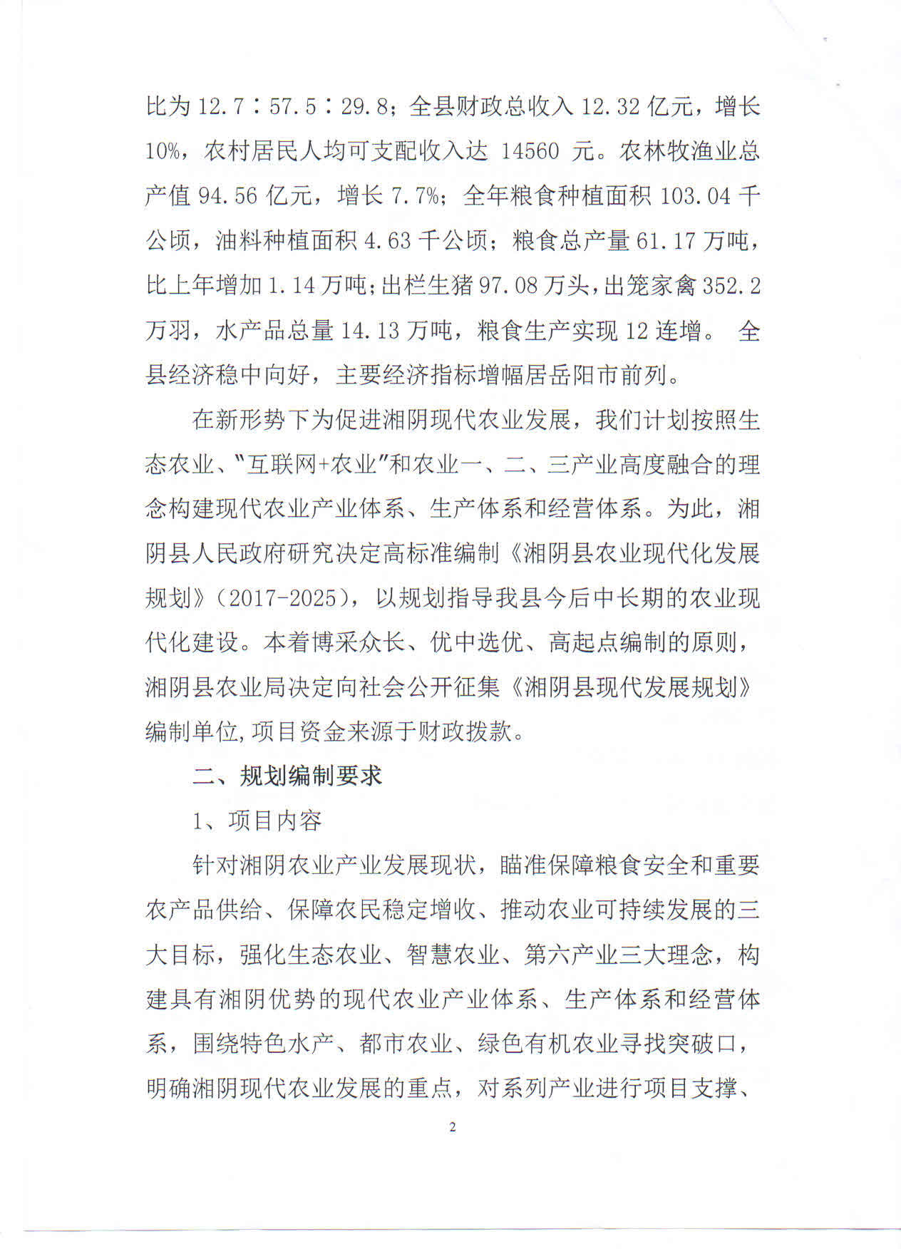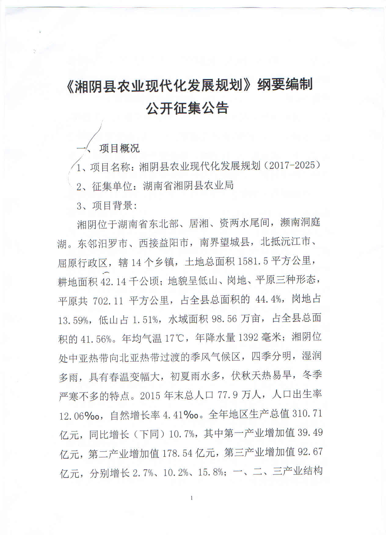 《湘阴县农业现代化发展规划》纲要编制公开征集公告