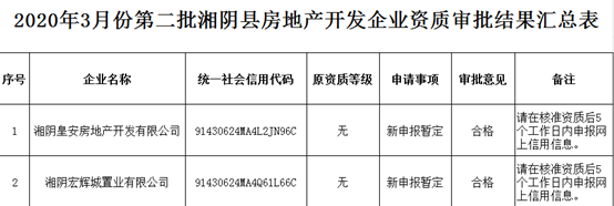 根据《房地产开发企业资质管理规定》(住房和城乡建设部令第24号)和《湖南省房地产开发企业资质管理实施细则》(湘建房〔2017〕209号)等有关法律法规规定,我局对2020年3月份第二批房地产开发企业资质申报材料进行了审查,审批结果如下:
