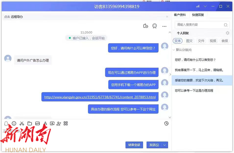 今年来,湘阴县行政审批服务局借助“互联网+”优势,积极探索政务服务智能化改革新模式,依托湘阴县政府门户网站和湘易办APP“湘阴证好办”专区,创新推出“远程导办”服务,正式开启“网购办事”新时代。企业群众发起“远程导办”业务申请,即可在线匹配客服人员,实现网上办事“一键直连窗口、问题快速解决、材料同步预审、一次高效办成”。同时,针对远程导办过程中存在的“问不到、看不懂、不会办、答不上”等问题,后台将综合运用多轮回答、相关部门协同等方式,做到“有问必答,答必解惑”,为企业群众提供精准解答服务。自“远程导办”平台上线以来,目前已完成业务咨询解答100余次。