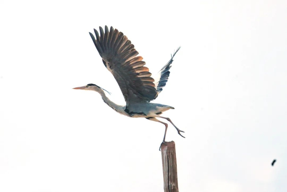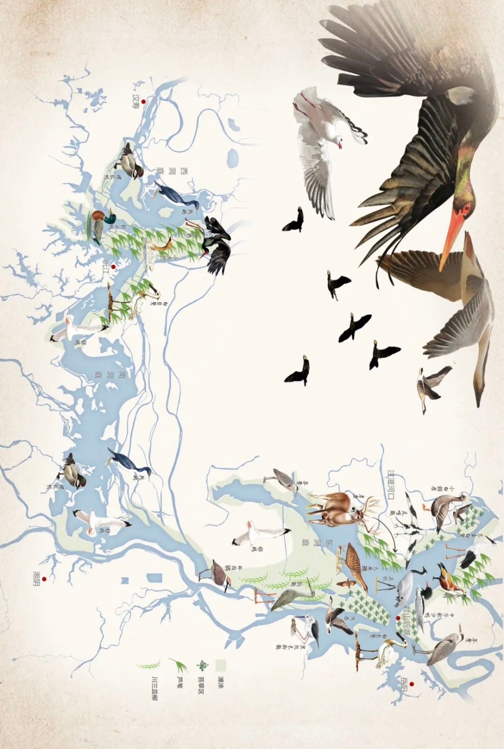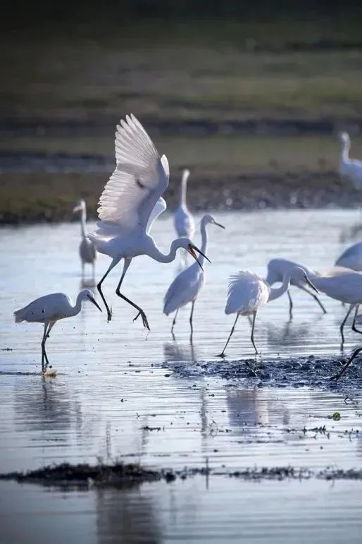 东方白鹳站在浅水处捕鱼,苍鹭、大白鹭也时常加入它的行列。水面上游弋着斑嘴鸭、绿翅鸭、绿头鸭、螺纹鸭、小天鹅,它们让绿意盎然的洞庭湖更富生机和灿烂。