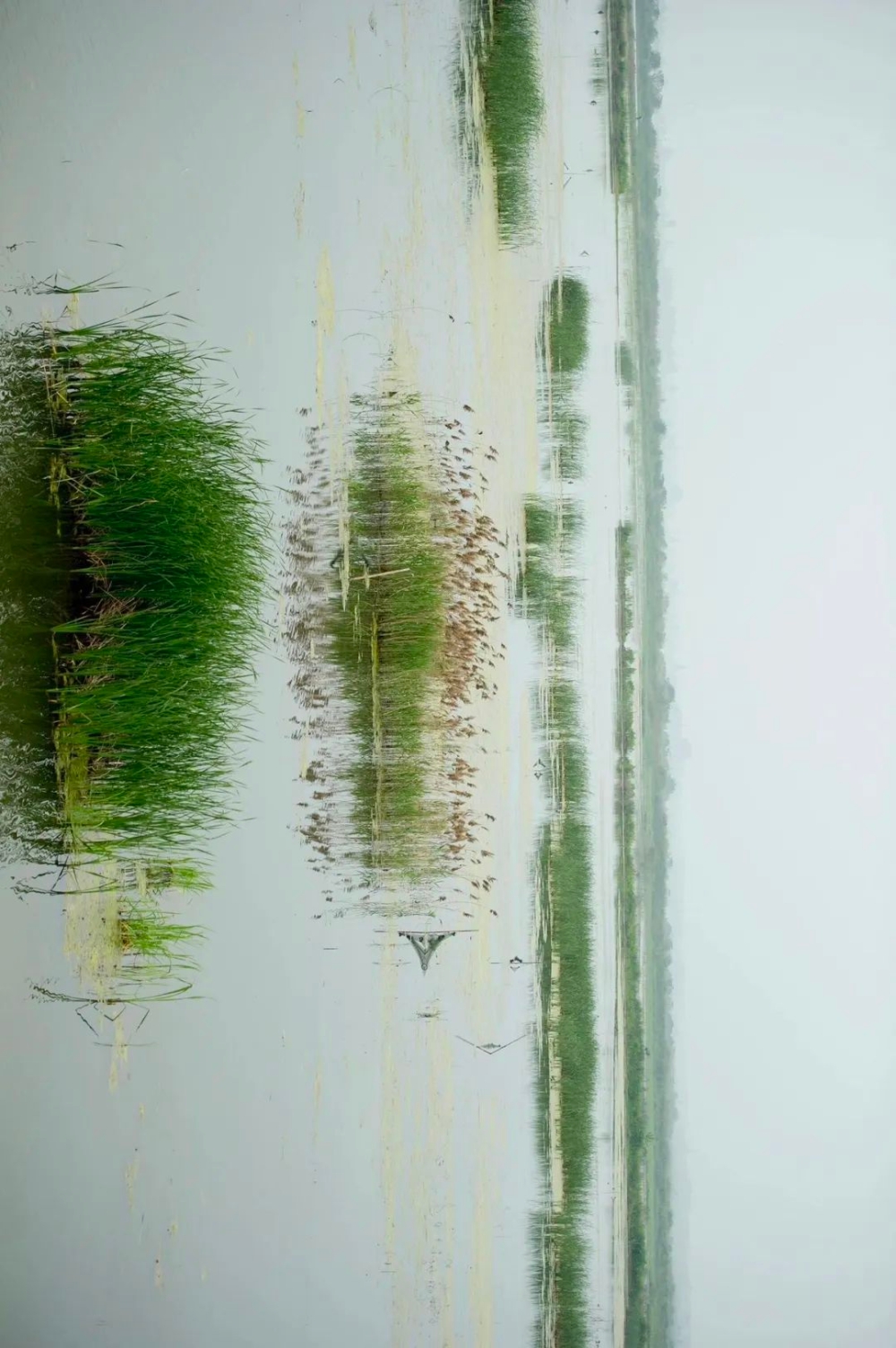 滩涂露出之后,播撒于湖床的草种开始发芽,并迅速形成“草原”。它们朝着水位线逼近,并尽可能地抢占陆地,于是湖床遍地铺绿。待到金秋,芦荻飘花,秋风瑟瑟,这绿色的帷幕中又多了一抹白,如同一幅多彩的中国画。