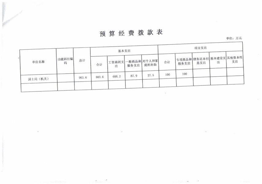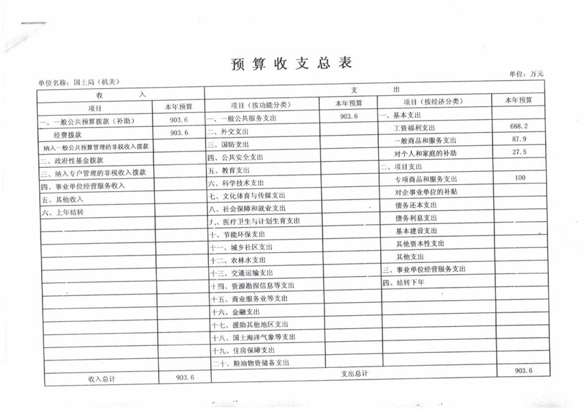 预算总支出903.6万元,其中:基本支出803.6万元,(工资福利支出688.2万元,一般商品和服务支出87.9万元,对个人和家庭的补助27.5万元);项目支出100万元。