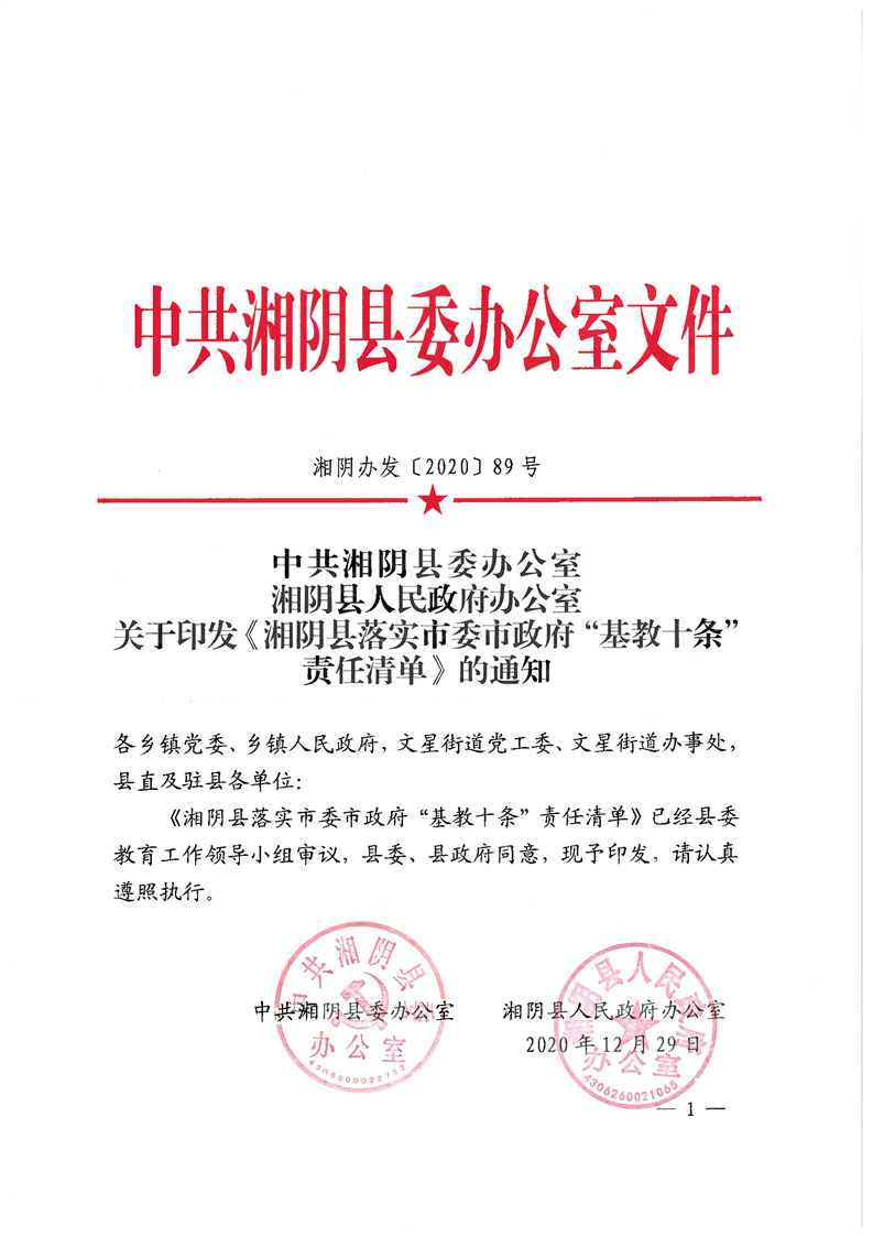 湘阴县落实市委市政府“基教十条”责任清单