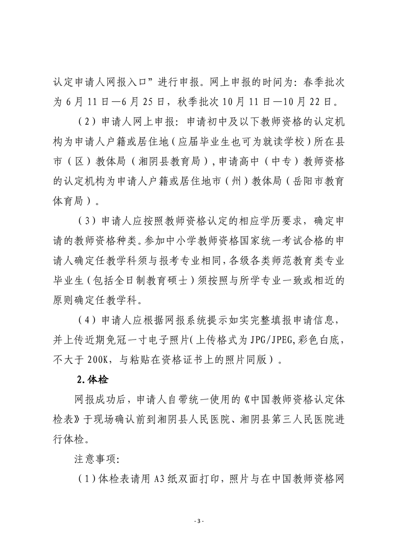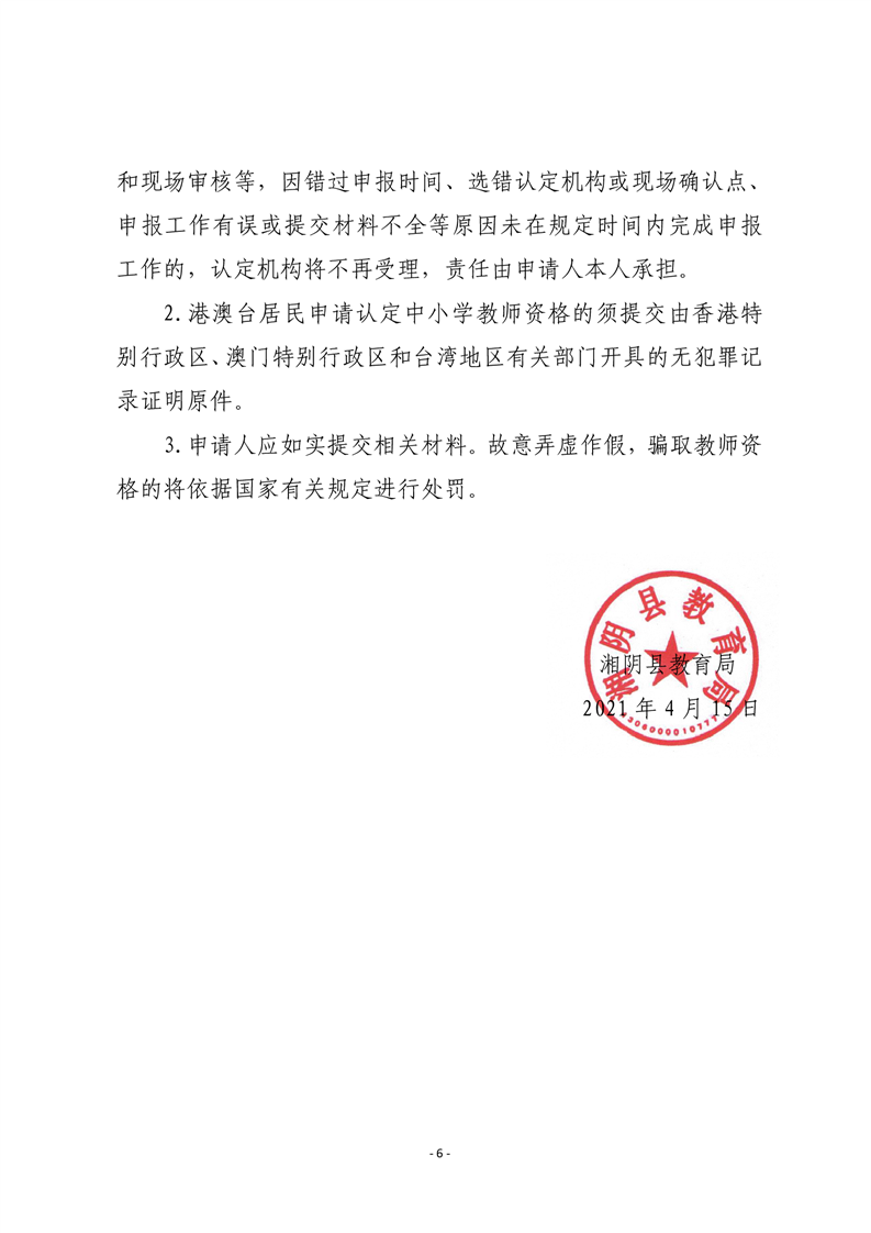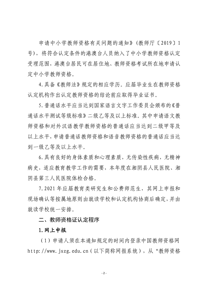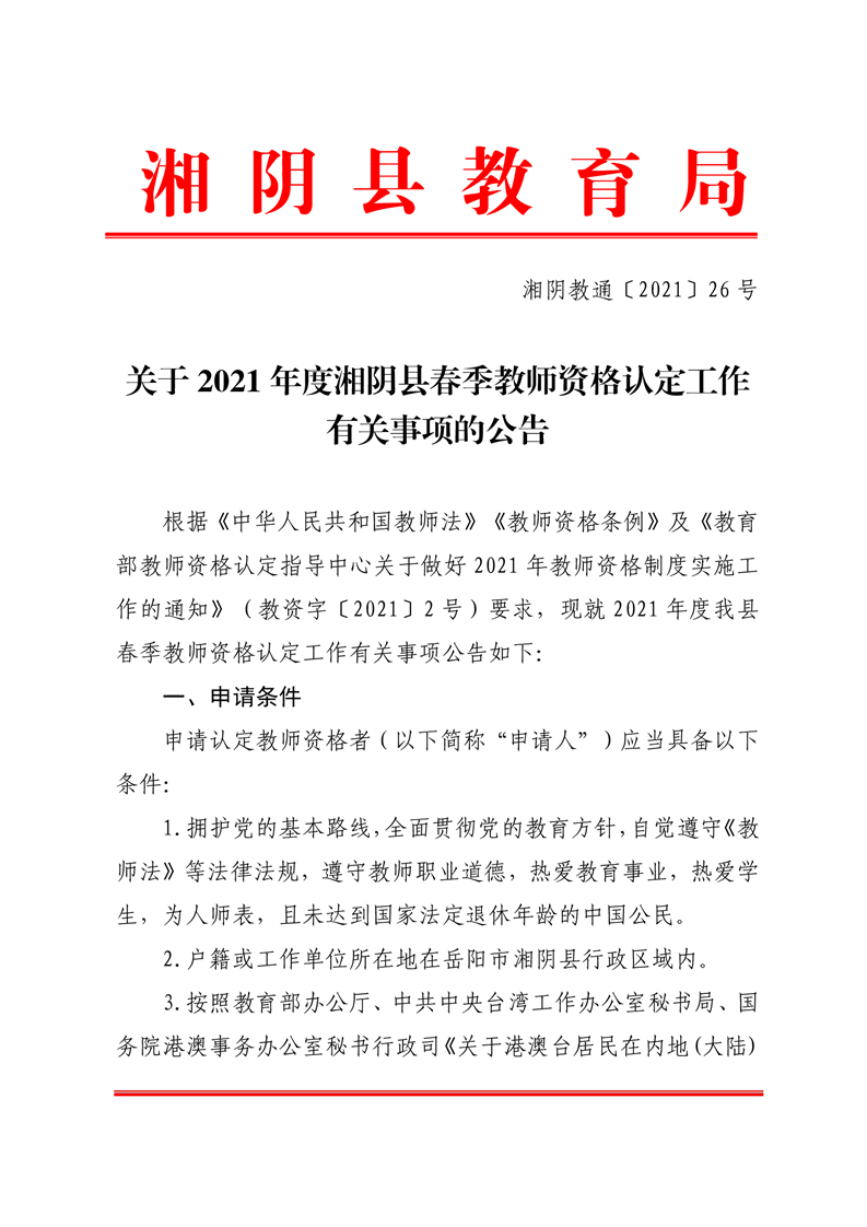湘阴教通〔2021〕26号 关于2021年度湘阴县春季教师资格认定工作有关事项的公告