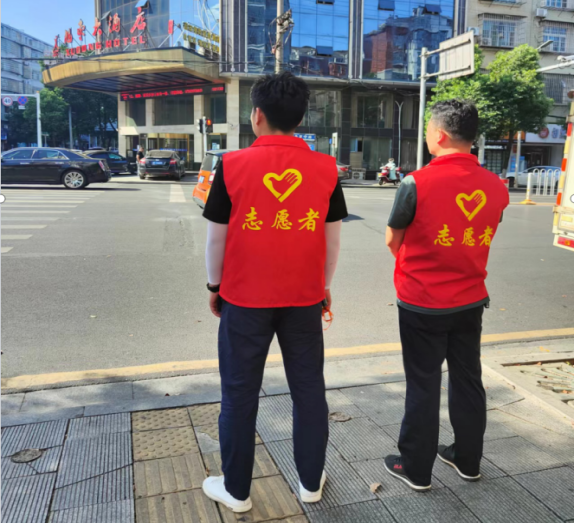 身穿红马甲,头戴红帽子,手拿小红旗和口哨,干职工站在十字路口,对来往行人和车辆的不文明行为吹哨提醒,并耐心劝导,号召广大市民朋友做文明行动的示范者,文明精神的传播者,共同提升城市整体形象,为我县创建全国文明城市贡献力量。
