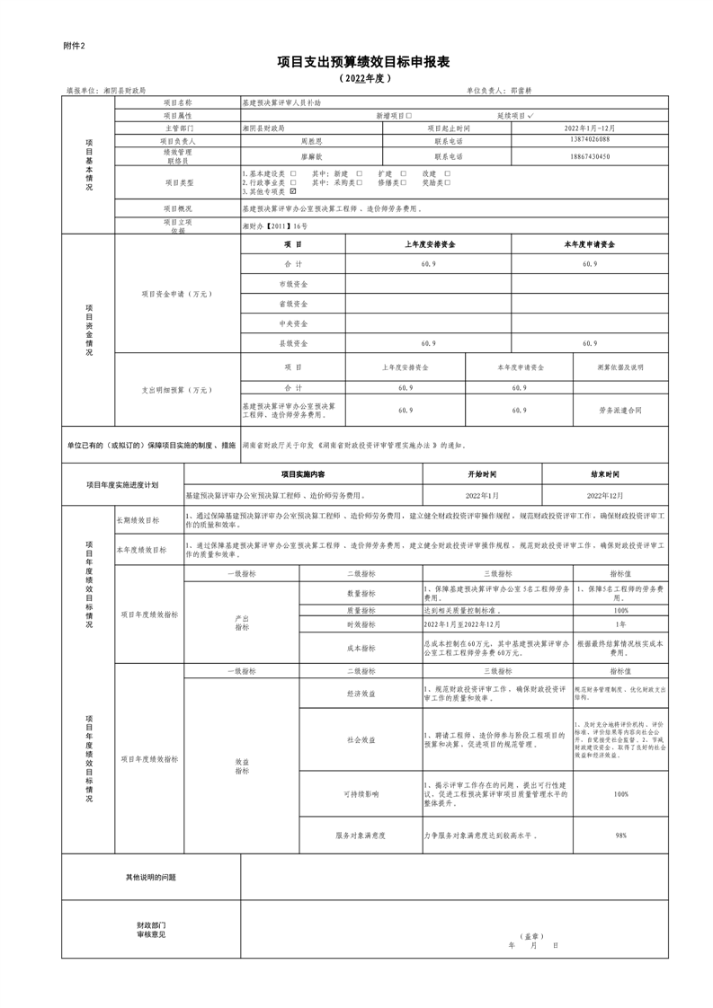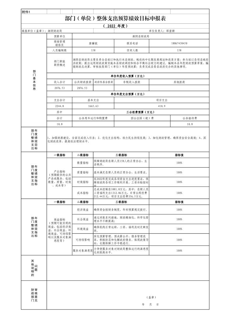 2022 年湘阴县财政局整体支出绩效目标2076.53万元,其中: