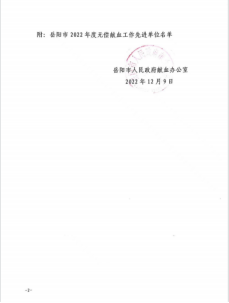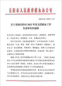 6.无偿献血工作先进单位。授奖单位:岳阳市人民政府献血办公室;获奖单位:洋沙湖镇