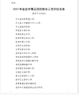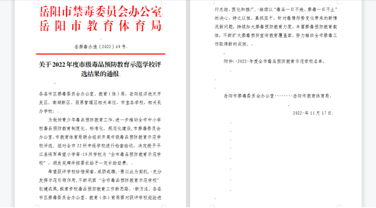 7.市级毒品预防教育示范学校。授奖单位:岳阳市文明办;获奖单位:洋沙湖镇长康中学