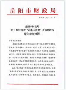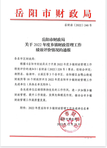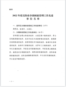 9.2022年度岳阳市乡镇财政管理工作先进单位。授奖单位:岳阳市财政局;获奖单位:洋沙湖镇财政所