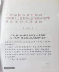 11.“五星”级基层人民武装部。授奖单位:中共岳阳市委组织部、岳阳市人力资源和社会保障局、岳阳军分区动员处;获奖单位:洋沙湖镇武装部