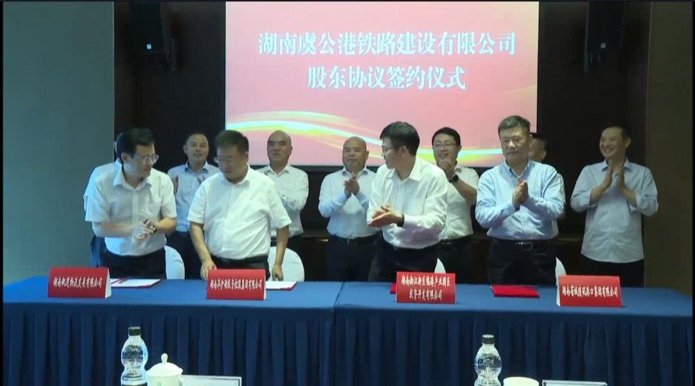 仪式上,湖南湘江新区临港产业园区投资开发有限公司、湖南洋沙湖投资控股集团有限公司、湖南轨道物流发展有限公司、湖南省城陵矶港口集团有限公司4家单位负责人签订了合作协议。根据协议,四方将共同组建湖南虞公港铁路建设有限公司,对虞公港货运铁路专用线进行投资、开发、建设、运营。