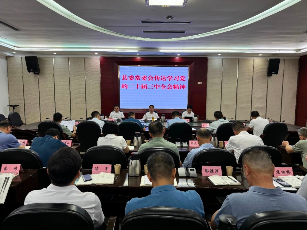 7月24日下午,县委常委会召开扩大会议,传达学习党的二十届三中全会精神,研究我县贯彻意见。县委书记、县长刘世奇主持并讲话,县人大常委会主任邓淼、县政协主席杨革新及全体在职县级领导参加。