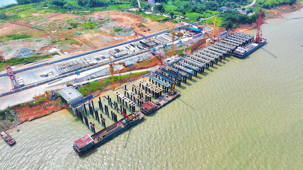 工期540天的虞公港一期工程码头项目目前已完成上、下游码头平台桩基95%、下横梁浇筑35%、引桥工程50%,码头面预制构件完成了90%。接下来,项目将进行吊装预制纵梁、预制纵梁上面吊装叠合板、浇筑码头面磨耗层等附属设施施工。