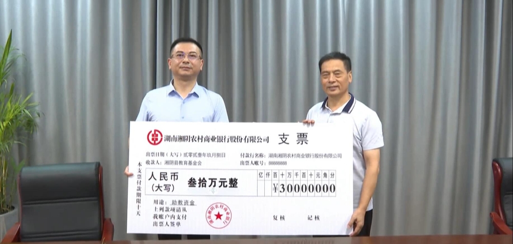 9月8日,湘阴农村商业银行股份有限公司向县教育发展基金会捐赠爱心款30万元用于助学助教。