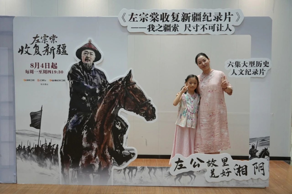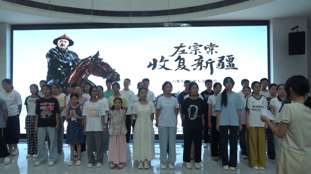 看片会特设的学生互动环节,成为镜头捕捉的焦点。现场,40名学生齐声朗诵《恭诵左公西行甘棠》,稚嫩而铿锵的诵读在展厅回荡:“大将筹边尚未还,湖湘子弟满天山。新栽杨柳三千里,引得春风度玉关……”经典的诗句,穿越时空,连接起先贤的伟业与少年的赤诚。
