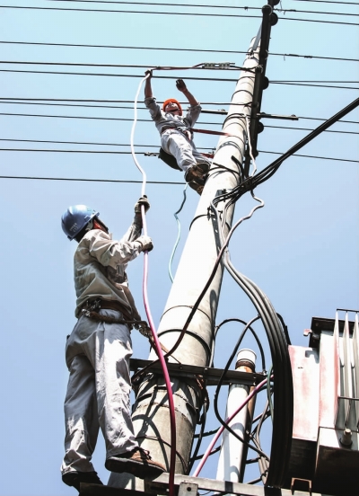 连日来,持续高温袭击,用电负荷骤增,县电业局全力及时抢修线路故障,确保抗旱救灾用电和城乡居民生活用电。图为