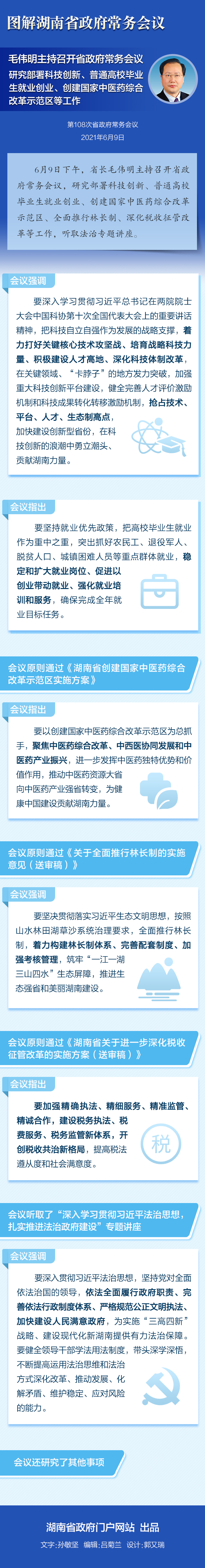 6月9日下午,省长毛伟明主持召开省政府常务会议,研究部署科技创新、普通高校毕业生就业创业、创建国家中医药综合改革示范区、全面推行林长制、深化税收征管改革等工作,听取法治专题讲座。