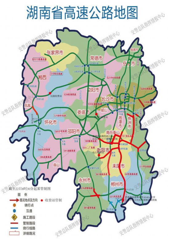 三湘都市报·新湖南客户端1月22日讯(记者 虢灿 实习生 张越 通讯员 苏景红)湖南省交警指挥中心今晨通报,截至22日7时30分,因起雾省内17条高速、共78个收费站、2条主干道实行临时交通管制。共涉及株洲、衡阳、邵阳、长沙、永州、郴州、娄底、怀化等8个支队辖区。具体情况如下: