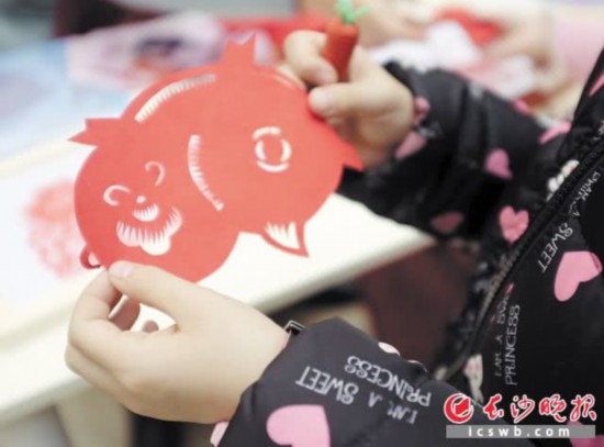 ←长沙博物馆里,孩子们看到剪纸老师剪的猪栩栩如生。