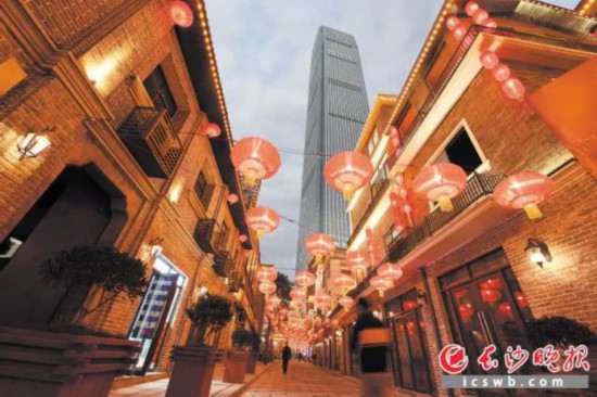 →登隆街上,高高挂起的灯笼和不远处的长沙国金中心相映成趣。