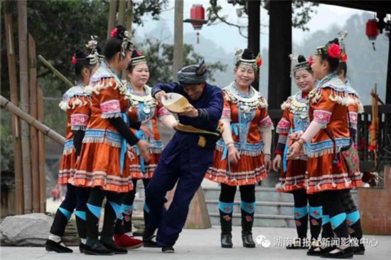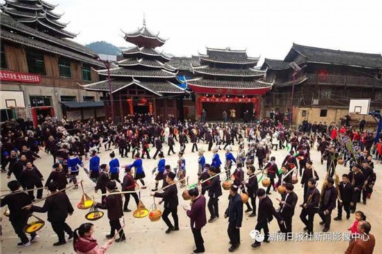 2月4日,农历除夕,靖州苗族侗族自治县岩脚侗寨,侗族村民在倾情演出大型原生态实景音乐剧《丝路女儿国》。刘杰华 谭子陵 摄