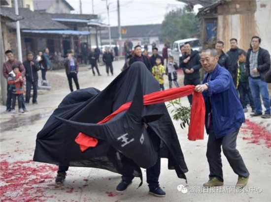 2月5日,江永县粗石江镇清溪村,瑶民在“耍春牛”。当天,该村开展“耍春牛”、舞龙、舞狮等民俗表演,欢度新春节佳节。潘百旺 摄
