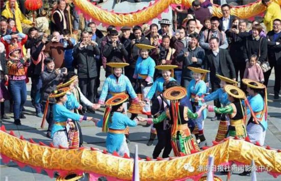 2月6日,溆浦县枫香瑶寨,村民们为远道而来的游客表演舞龙和花瑶传统民俗。湖南日报·华声在线记者 李健 通讯员 张微渺 摄