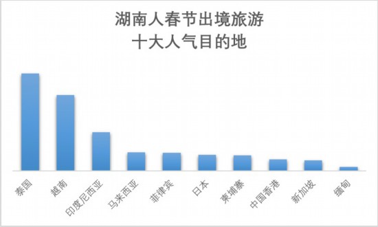 湖南游客在春节期间出境游都去了哪儿?根据携程跟团游和自由行订单数据,人气最高的前十大目的地依次是泰国、越南、印度尼西亚、马来西亚、菲律宾、日本、柬埔寨、中国香港、新加坡和缅甸。