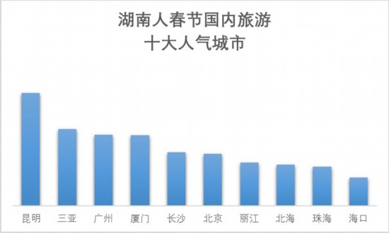 湖南人春节国内游都去了哪儿?根据携程跟团游和自由行数据,十大国内游人气城市分别是昆明、三亚、广州、厦门、长沙、北京、丽江、北海、珠海和海口。