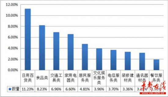 从热线和平台投诉的数据分析看,排在前十位的投诉分别是:日用百货类、食品类、交通工具类、家用电器类、居民服务类、文化娱乐服务类、电信服务类、装修建材类、通讯器材类、餐饮服务类,详见下图:
