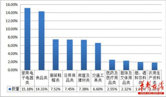 从现场投诉的数据分析看,排在前十位的投诉分别是:家用电子电器类、食品类、服装鞋帽、日用商品类、房屋及建材类、交通工具类、医药及医疗用品类、首饰及文体用品类、烟、酒和饮料类、农用生产资料类,详见下图。(记者 戴仲辉 彭天思)