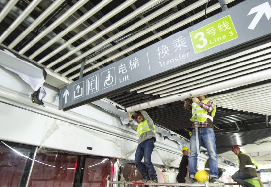 长沙地铁4号线进入载客试运营前的最后冲刺阶段。昨天,记者在阜埠河站看到,数百名工人正紧张有序进行车站最后的装饰装修,力保该站如期投入使用。