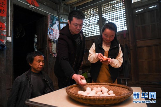 在湖南湘西龙山县洛塔乡楠竹村,吴添春(右)在村民家中检查收购的鸡蛋(3月11日摄)。出生于湘西龙山县洛塔乡的90后姑娘吴添春帮助村民通过电商卖起山货。 新华社记者 薛宇舸 摄