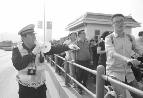 橘子洲大桥上交警正在指挥人行道的交通。