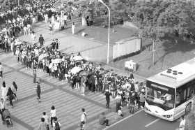 5月2日16点左右,橘子洲地铁站和公交车站更是挤满了人,排着的长队绕着围栏转了好几个弯,足有十余米长。因为坐车、坐地铁出橘子洲的人太多,不少人选择走路上桥,到了河西或者五一广场附近,再搭乘别的交通工具离开。可不曾想,上下桥的两个旋转楼梯都因为人流太多,人被堵在了楼梯上,几乎是以“龟速”在挪动,半天都没动一步。