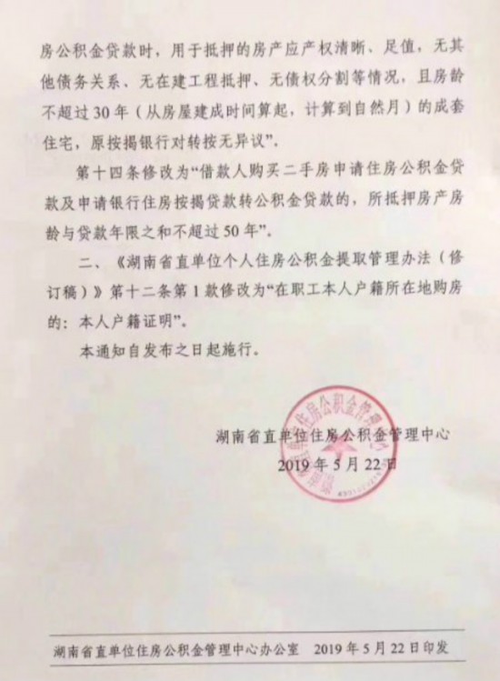 昨日,记者从湖南省直单位住房公积金管理中心获悉,《关于调整部分公积金政策的通知》已于近日印发。《通知》指出,借款人购买二手房申请贷款时,所购房屋应为房龄不超过30年(从房屋建成时间算起)的成套住宅,产权清晰,无债务纠纷。《通知》自5月22日起施行。