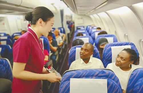 6月12日凌晨,长沙首飞内罗毕的航班上,空姐在为旅客提供服务。邓晶琎 摄