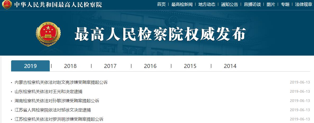 据最高人民检察院网站消息,13日,江苏湖南等5省市检察机关依法查办5名涉嫌受贿罪的厅级官员。