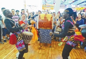 6月28日,首届中国-非洲经贸博览会展区,湘西苗鼓与非洲手鼓同台表演,吸引了众多观众。