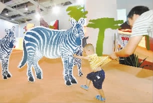 6月29日,非洲沙漠生态环境展区,一名小朋友与斑马亲密接触。 湖南日报记者 田超 摄